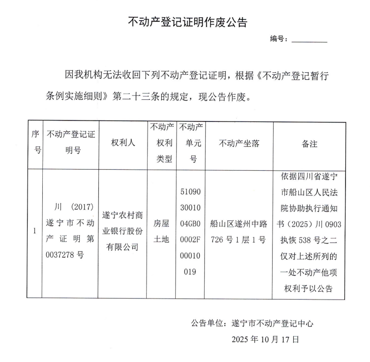 不动产登记证明作废公告(遂宁农村商业银行股份有限公司)