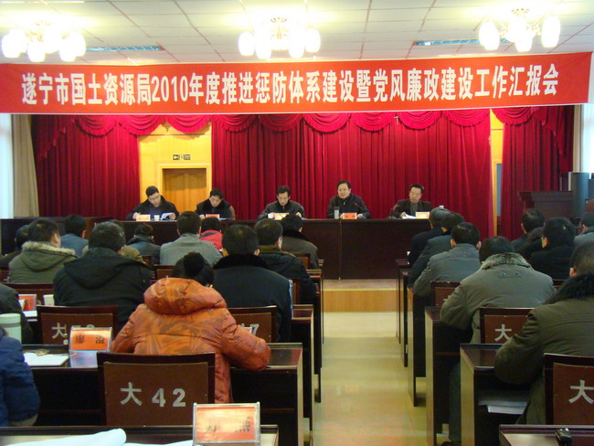 会上,市国土资源局党委书记、局长陶琳作了我局2010年度党委推进惩防体系建设工作及个人落实党风政风建设责任制情况汇报,对2010年度全市国土资源管理工作情况和党风廉政建设情况进行了总结,客观深入地分析了班子和个人存在的不足,并提出了下一步努力方向。市纪委监察局机关党委书记、检查组组长顾渐阔在会上作了动员,并对我局的惩防体系建设工作给予了肯定。