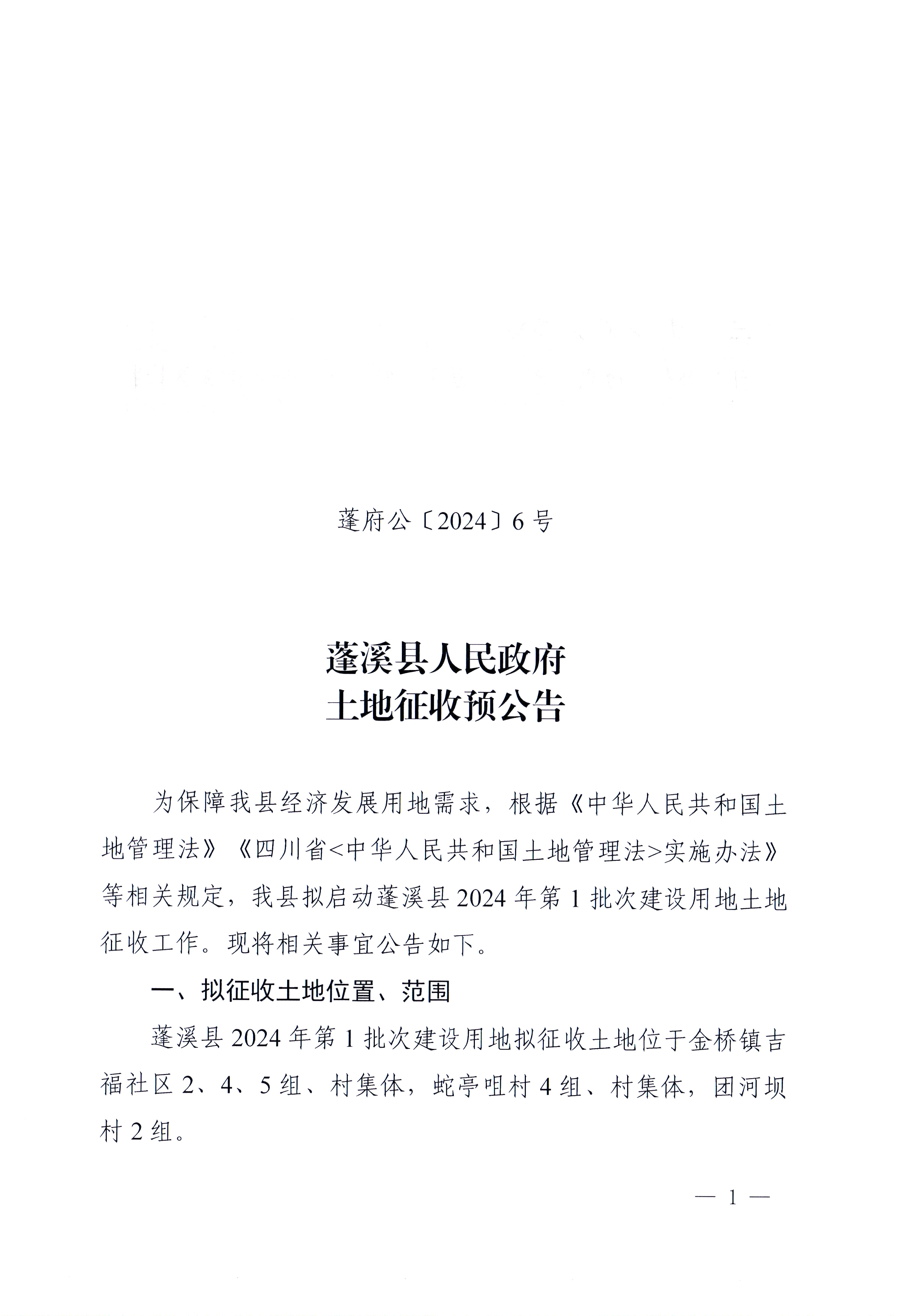 蓬溪县人民政府土地征收预公告(蓬府公〔2024〕6号)