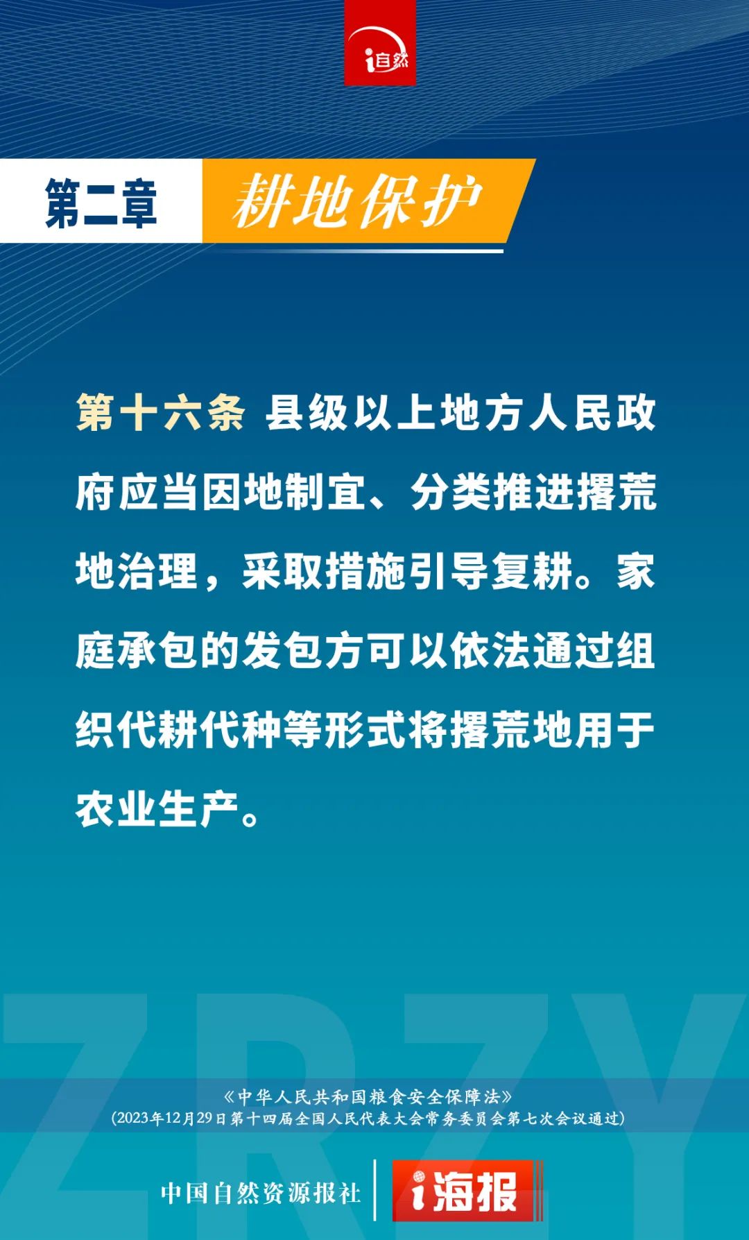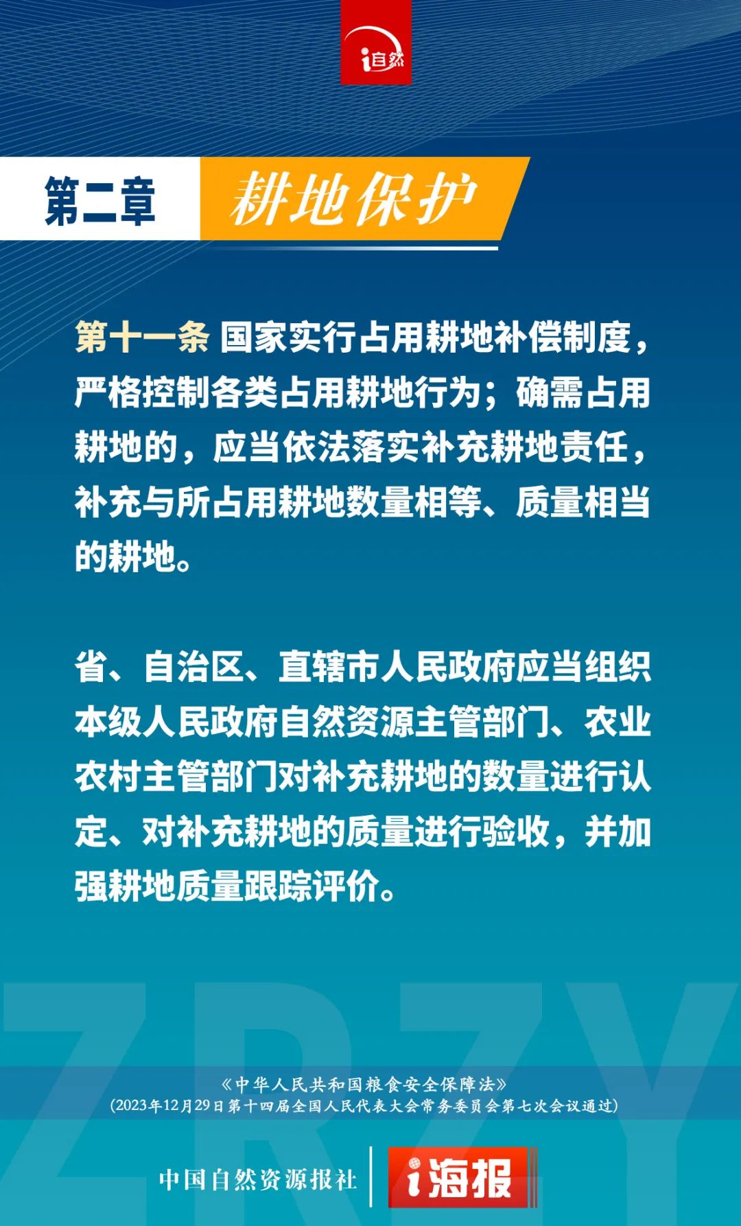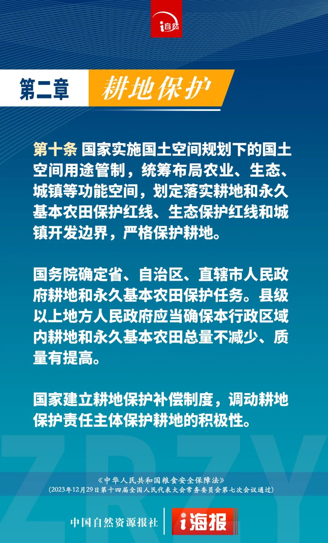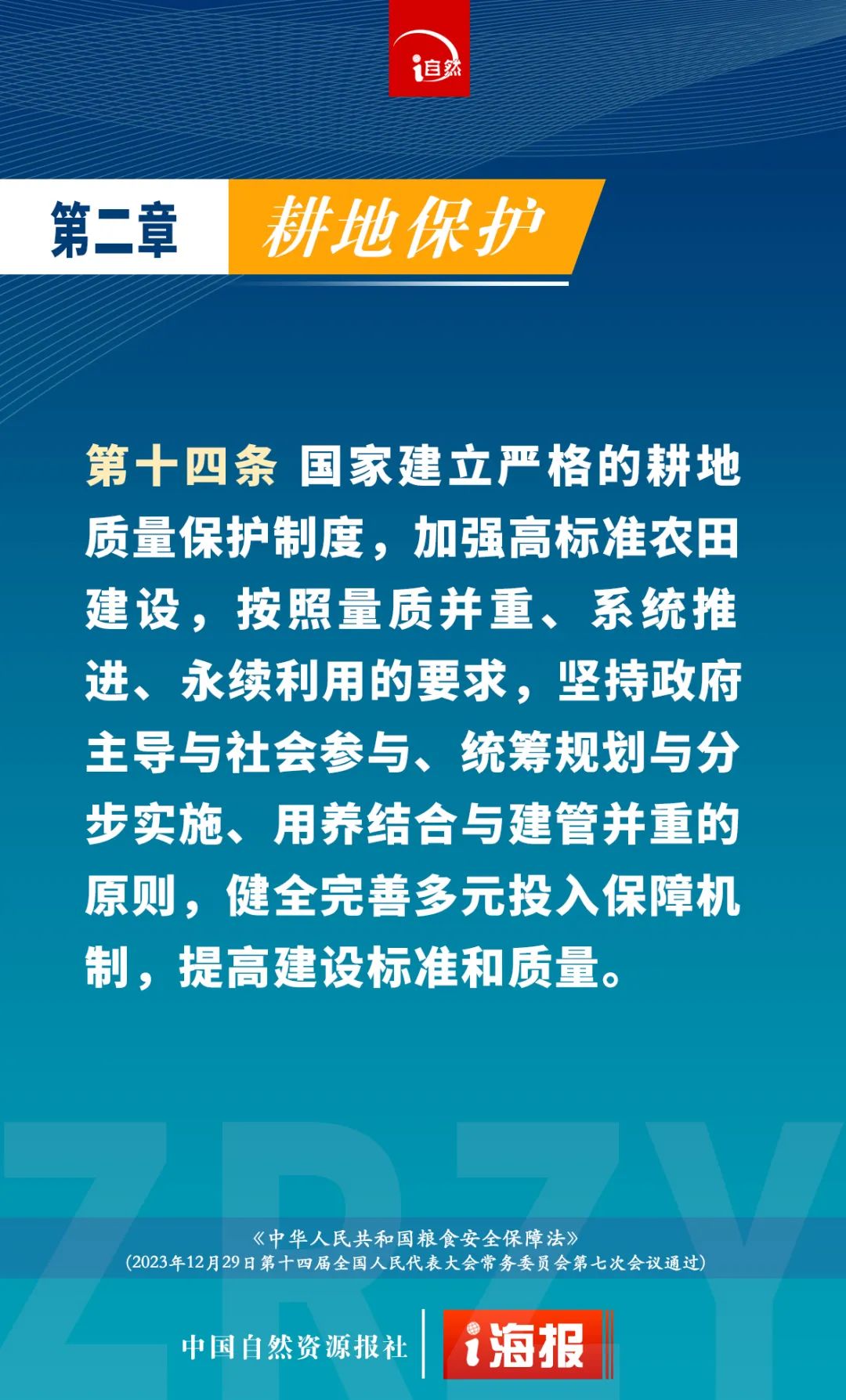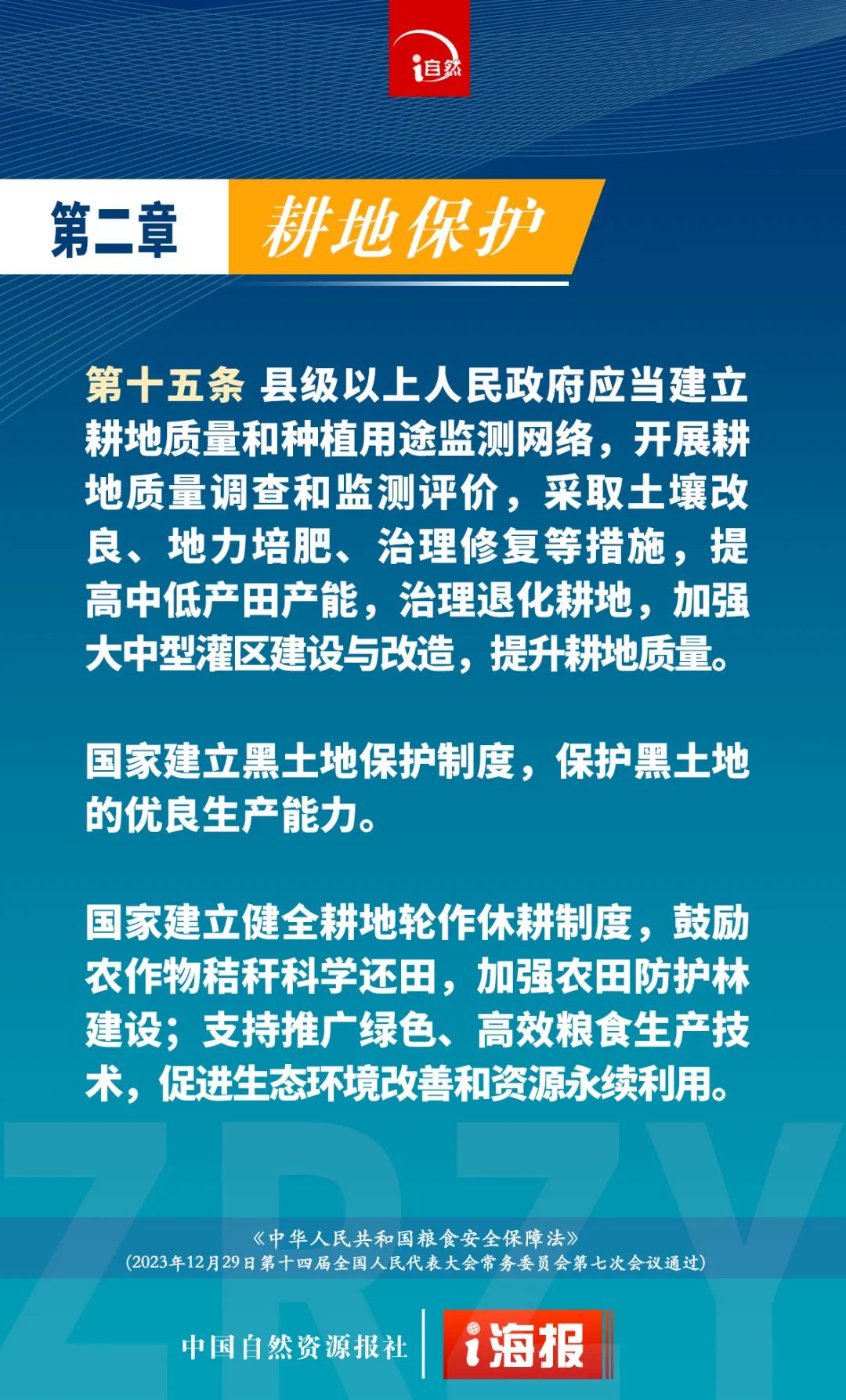 十四届全国人大常委会第七次会议12月29日表决通过《中华人民共和国粮食安全保障法》,自2024年6月1日起施行这部法律共11章74条第二章为耕地保护。