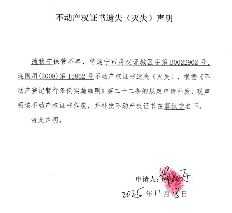 不动产权证书遗失(灭失)声明(蒲秋宁)