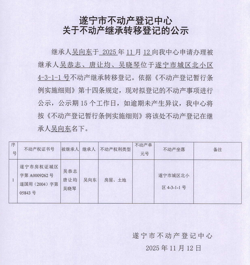 遂宁市不动产登记中心关于不动产继承转移登记的公示(吴向东)