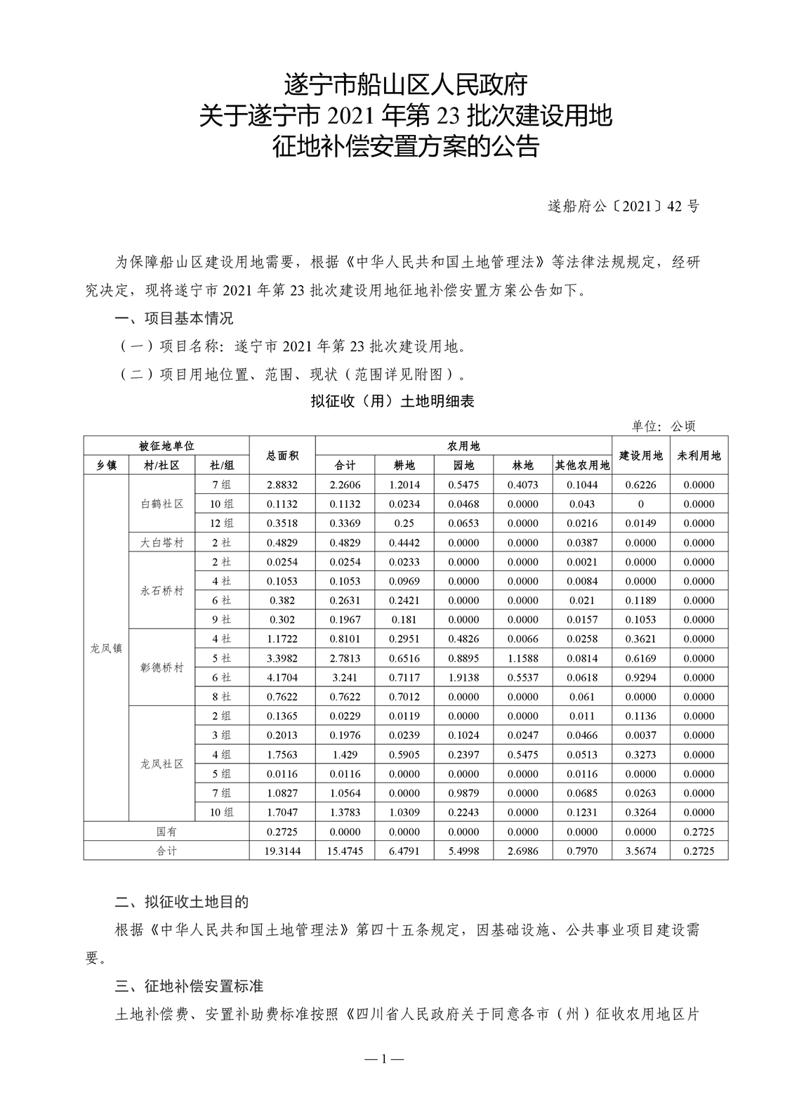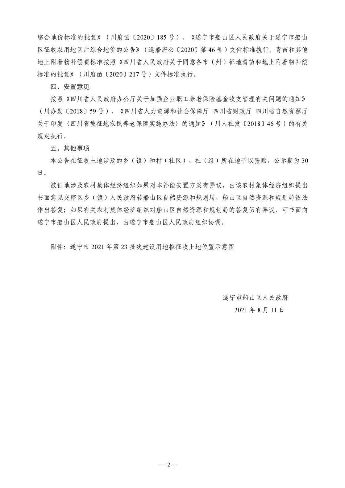 遂宁市船山区人民政府关于遂宁市2021年第23批次建设用地征地补偿安置方案的公告
