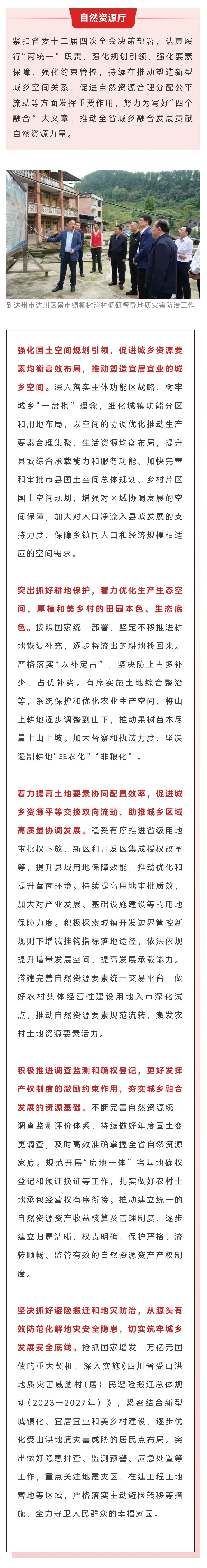 12月29日四川机关党建发布厅党组书记、厅长、省自然资源总督察徐志文的署名文章《为扎实推进城乡融合发展贡献自然资源力量》。