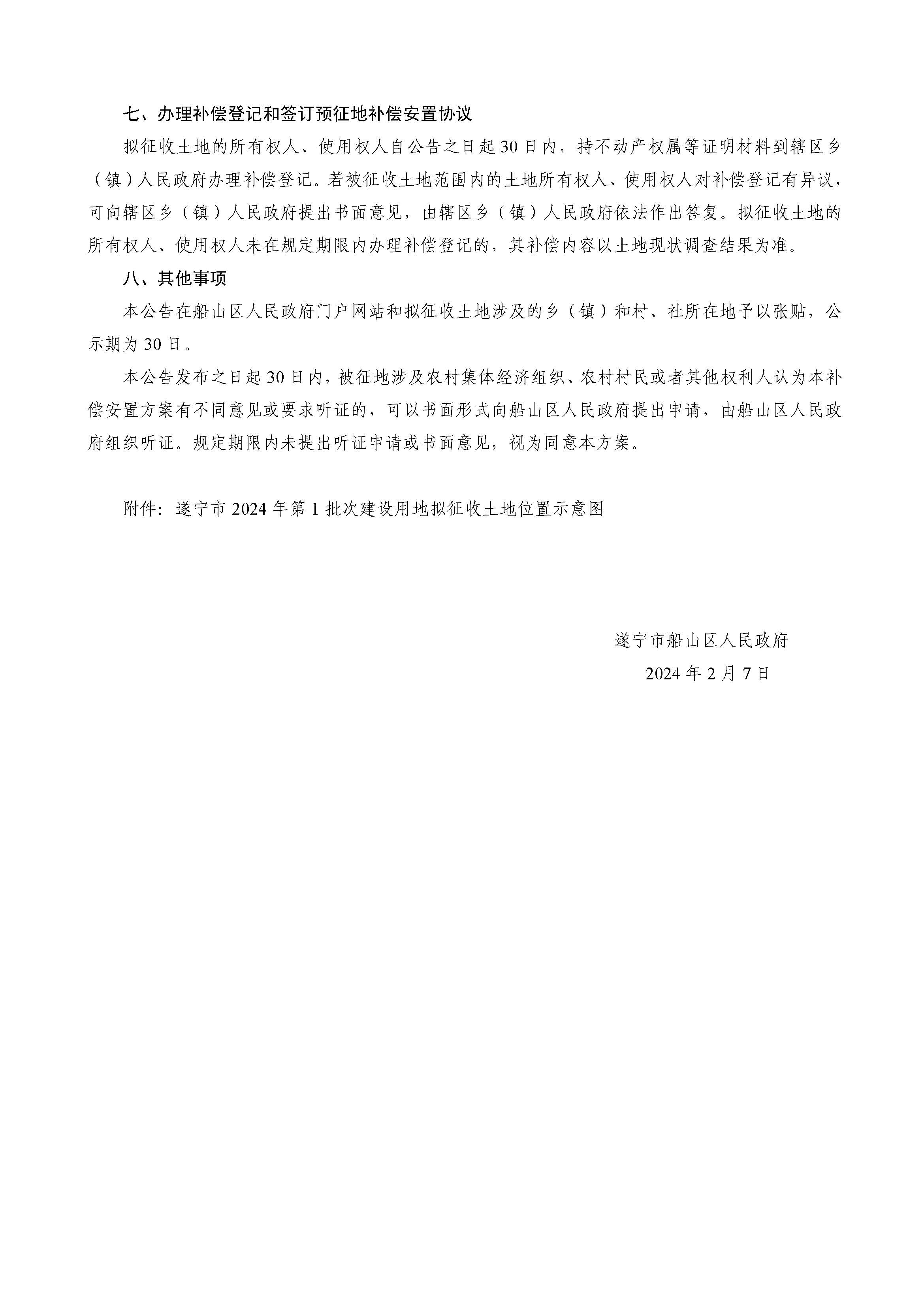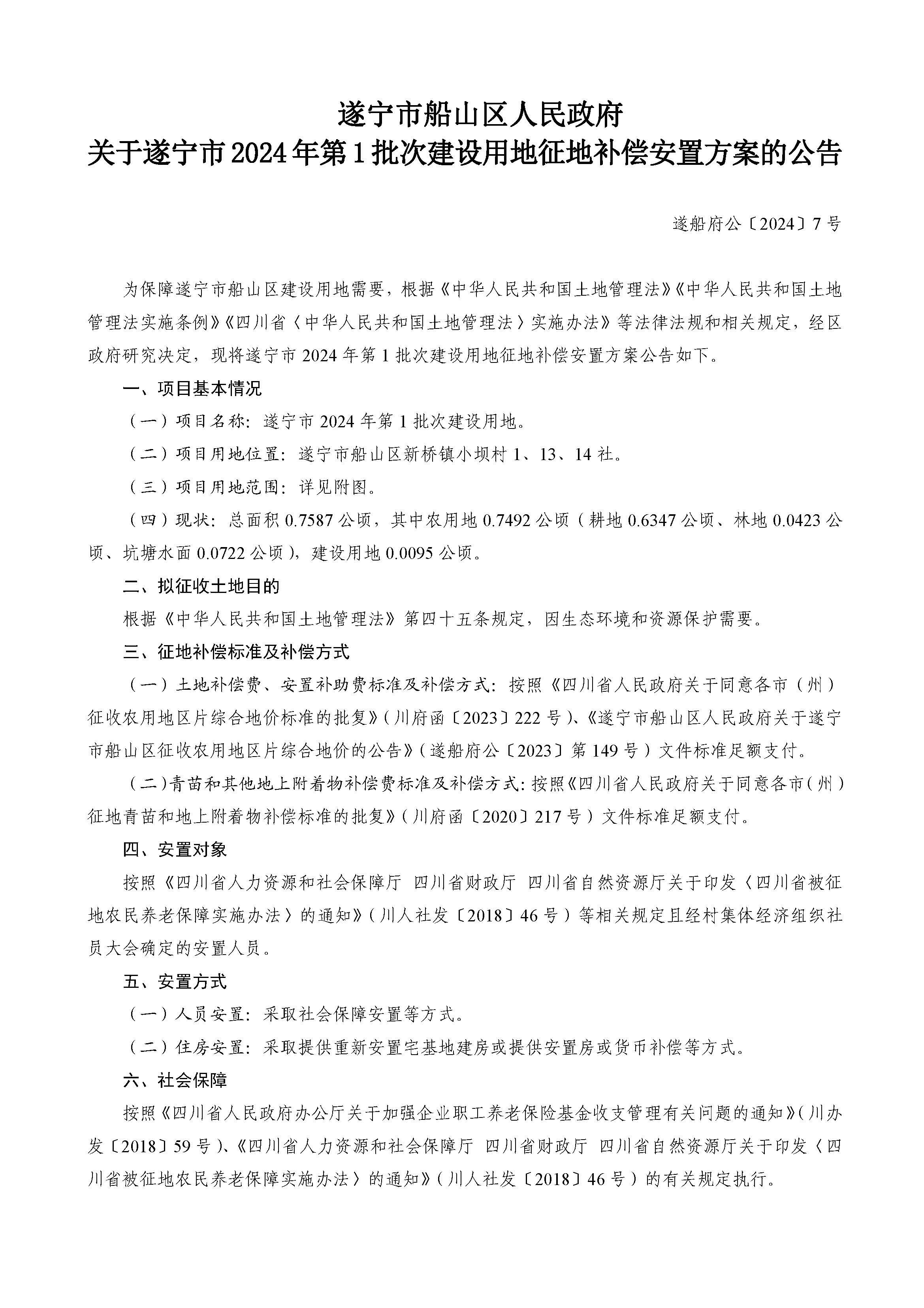 遂宁市船山区人民政府关于遂宁市2024年第1批次建设用地征地补偿安置方案的公告 (遂船府公〔2024〕7号)