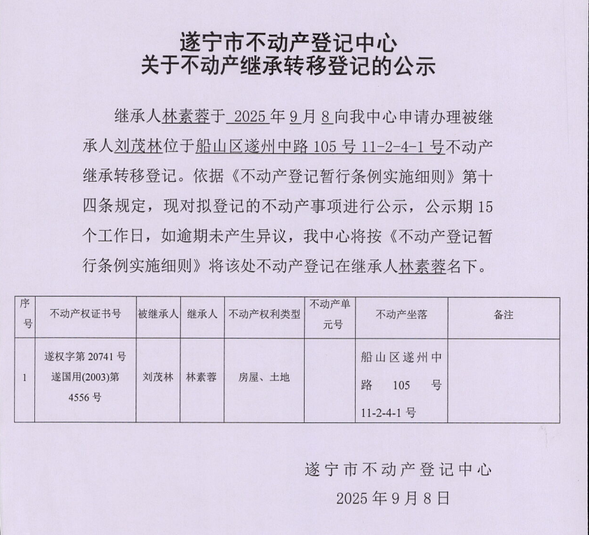 遂宁市不动产登记中心关于不动产继承转移登记的公示(林素蓉)