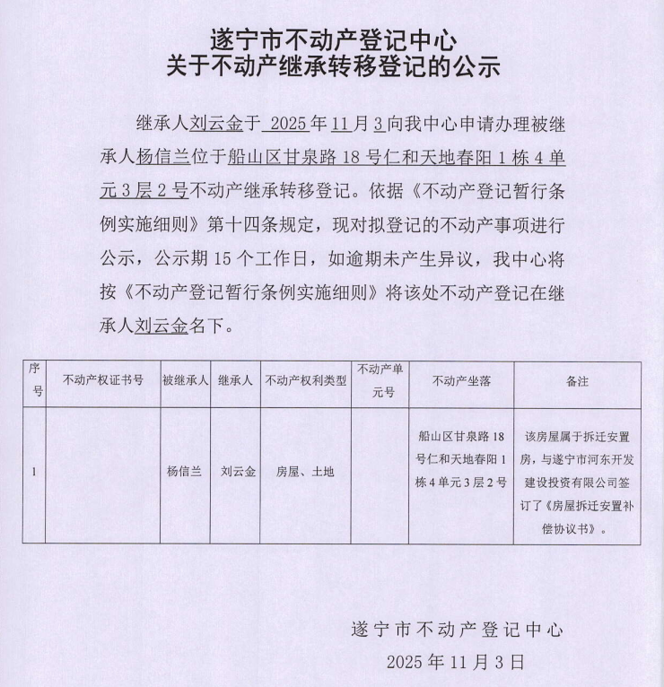 遂宁市不动产登记中心关于不动产继承转移登记的公示(刘云金)