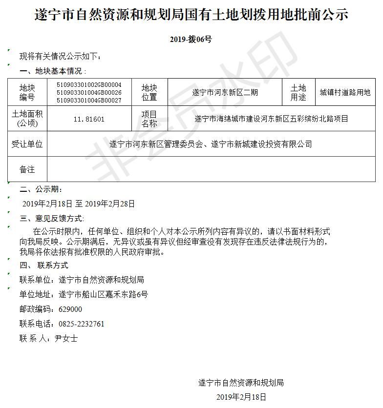 遂宁市自然资源和规划局国有土地划拨用地批前公示(2019-拨06号)