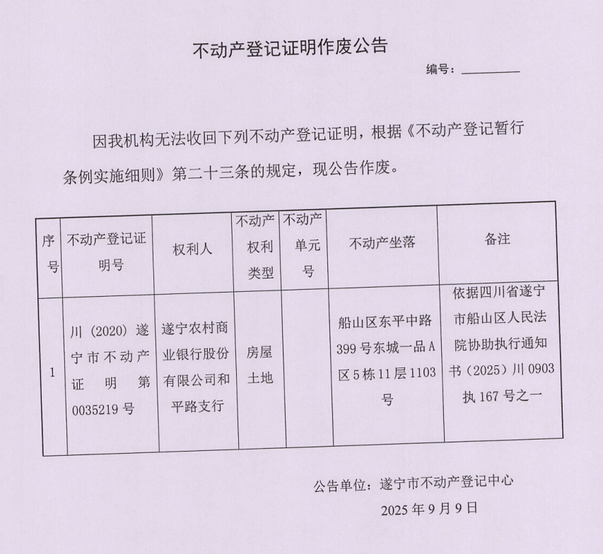 不动产登记证明作废公告(遂宁农村商业银行股份有限公司和平路支行)