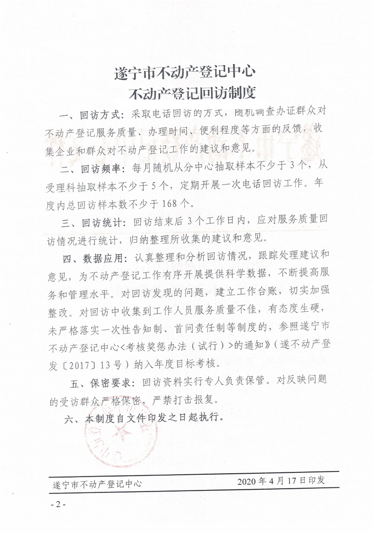 为进一步优化我市营商环境,深入落实“限时服务承诺”,提高工作效率,提升服务质量,现将《遂宁市不动产登记中心不动产登记回访制度》印发你们,请遵照执行。