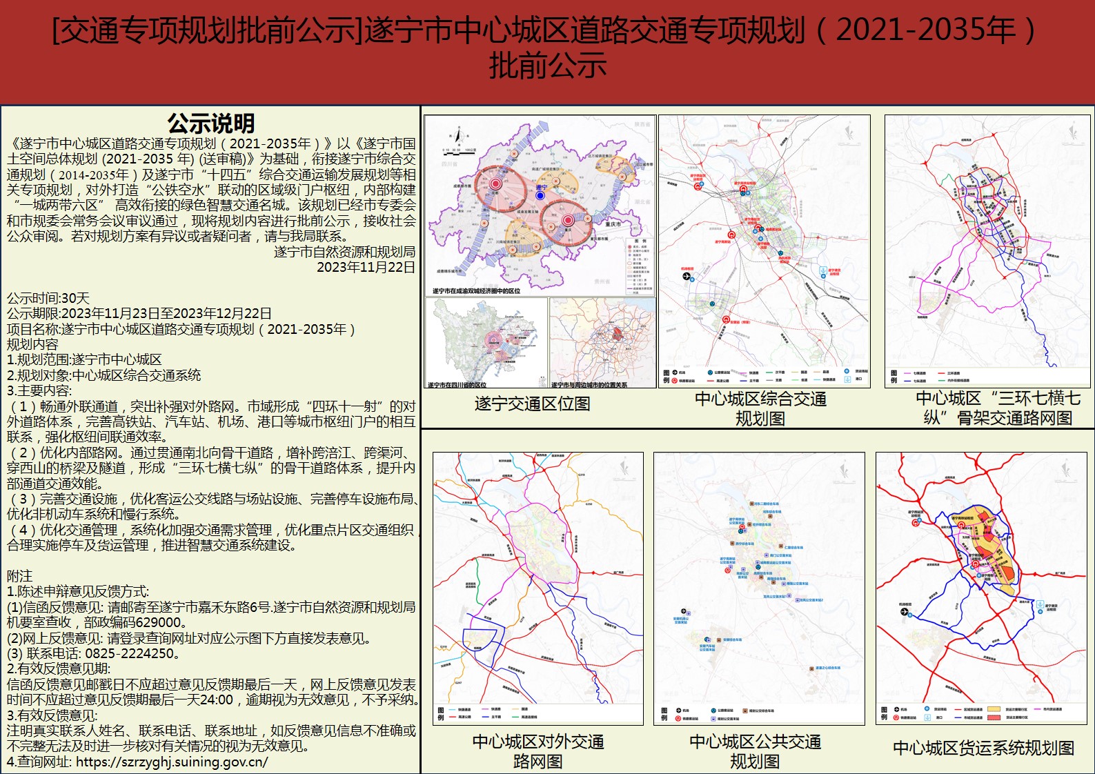 《遂宁市中心城区道路交通专项规划(2021-2035年)》以《遂宁市国土空间总体规划 (2021-2035 年) (送审稿)》为基础,衔接遂宁市综合交通规划(2014-2035)及遂宁市“十四五”综合交通运输发展规划等相关专项规划,对外打造“公铁空水”联动的区域级门户枢纽,内部构建“一城两带六区” 高效衔接的绿色智慧交通名城。该规划已经市专委会和市规委会常务会议审议通过,现将规划内容进行批前公示,接受社会公众审阅。若对规划方案有异议或者疑问者,请与我局联系。
