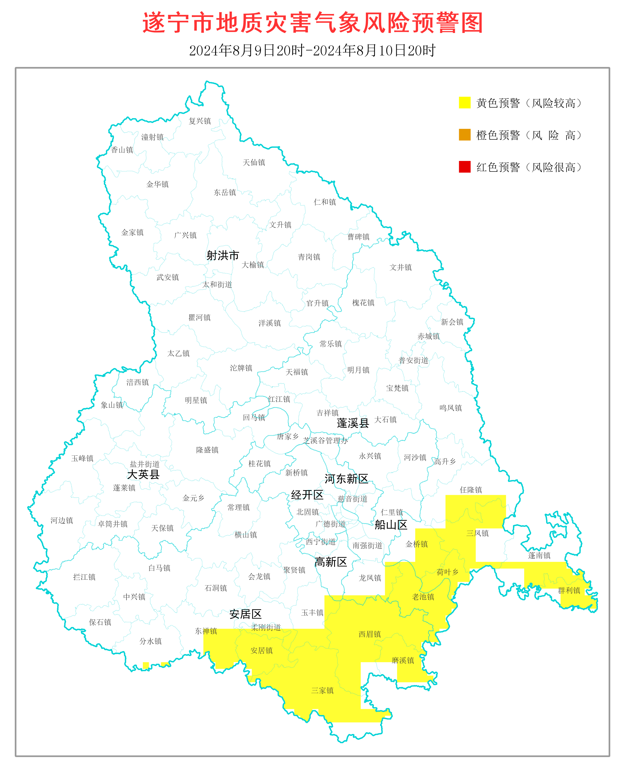 预警范围:船山区龙凤镇、老池镇,安居区柔刚街道、凤凰街道、安居镇、东禅镇、分水镇、三家镇、玉丰镇、西眉镇、磨溪镇,蓬溪县任隆镇、三凤镇、蓬南镇、群利镇、金桥镇、荷叶乡,高新区保升镇。