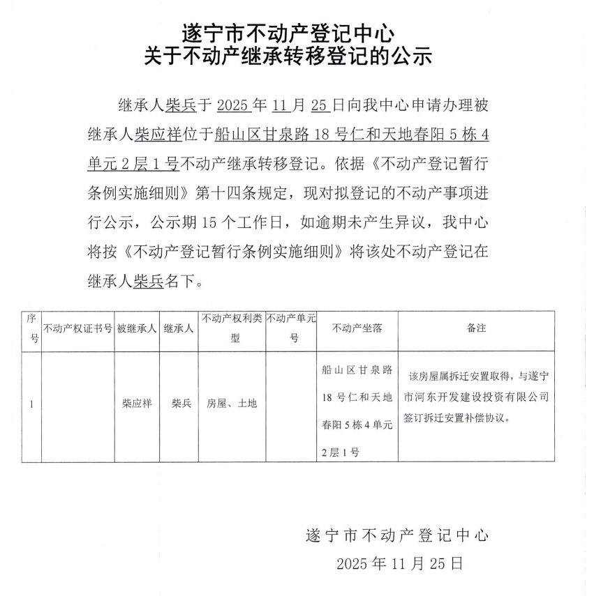 遂宁市不动产登记中心关于不动产继承转移登记的公示(柴兵)