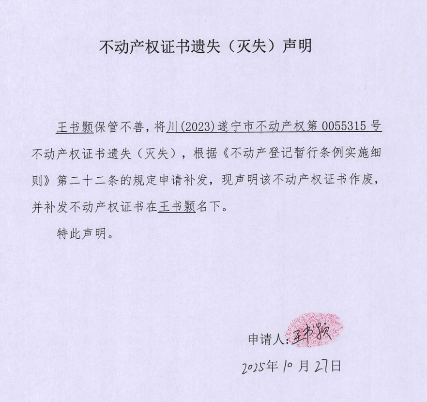 不动产权证书遗失(灭失)声明(王书颢)