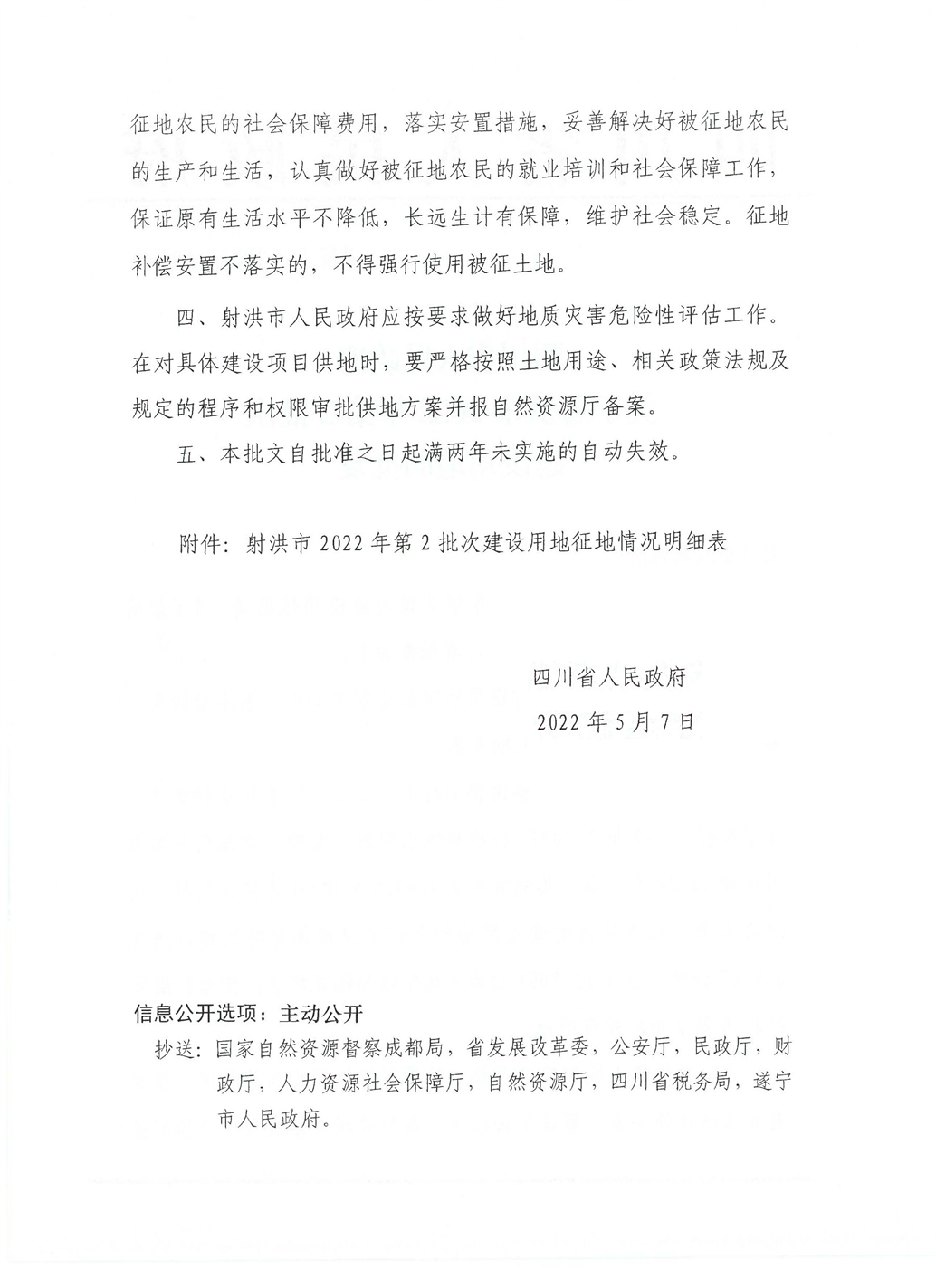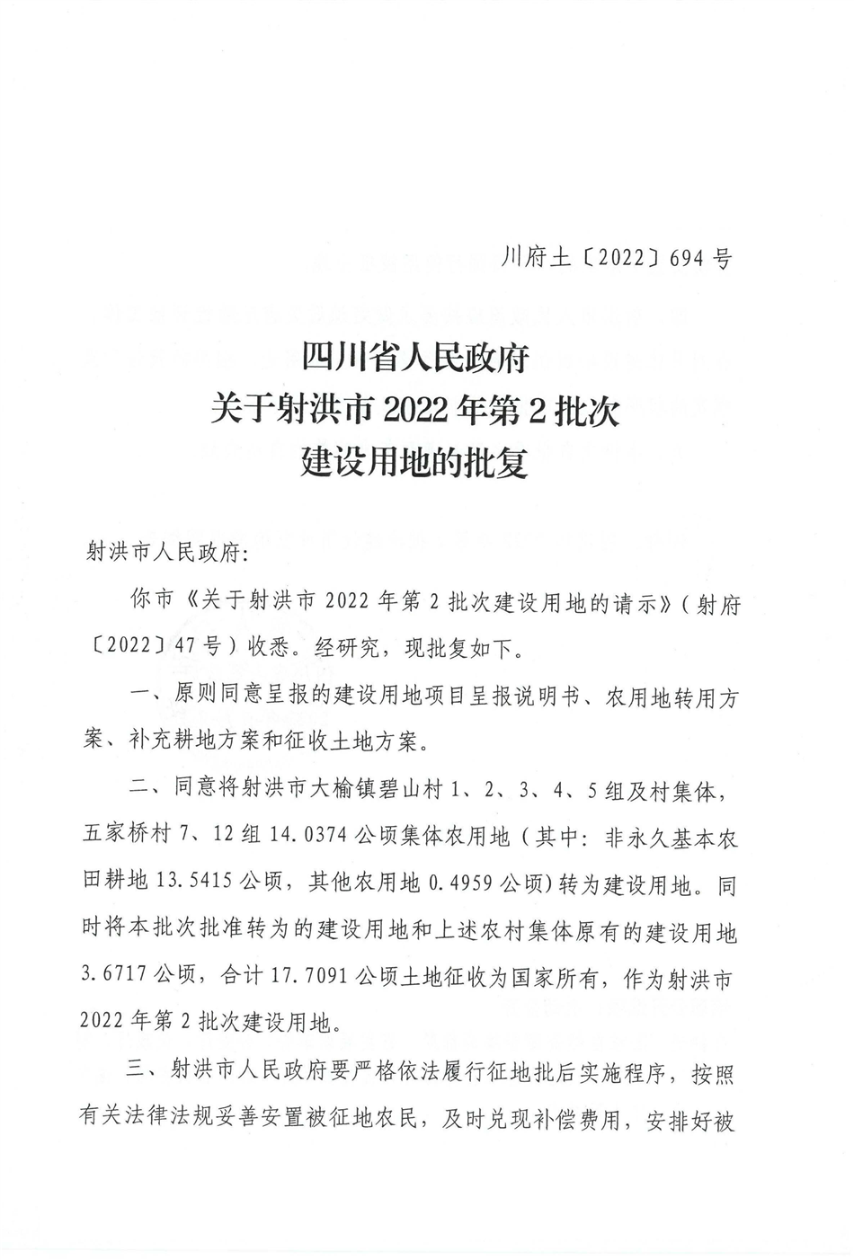 四川省人民政府关于射洪市2022年第2批次建设用地的批复(川府土〔2022〕694号)