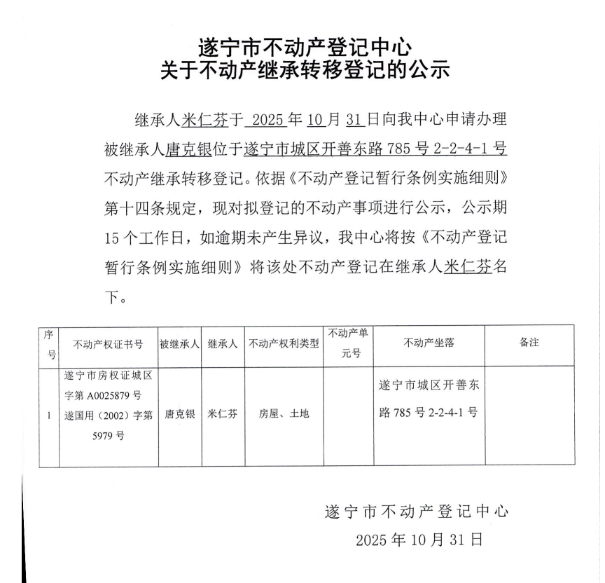 遂宁市不动产登记中心关于不动产继承转移登记的公示(米仁芬)