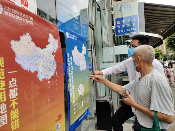 8月30日上午,我局紧紧围绕“规范使用地图,一点都不能错”宣传主题,联合富源路街道办事处开展了2021年测绘法宣传日暨国家版图意识宣传“进社区”活动,通过悬挂横幅、播放音频、发放遂宁红色旅游线路、地图等宣传资料,进一步提升了社会公众的国家版图意识、国家主权意识和爱国情怀。