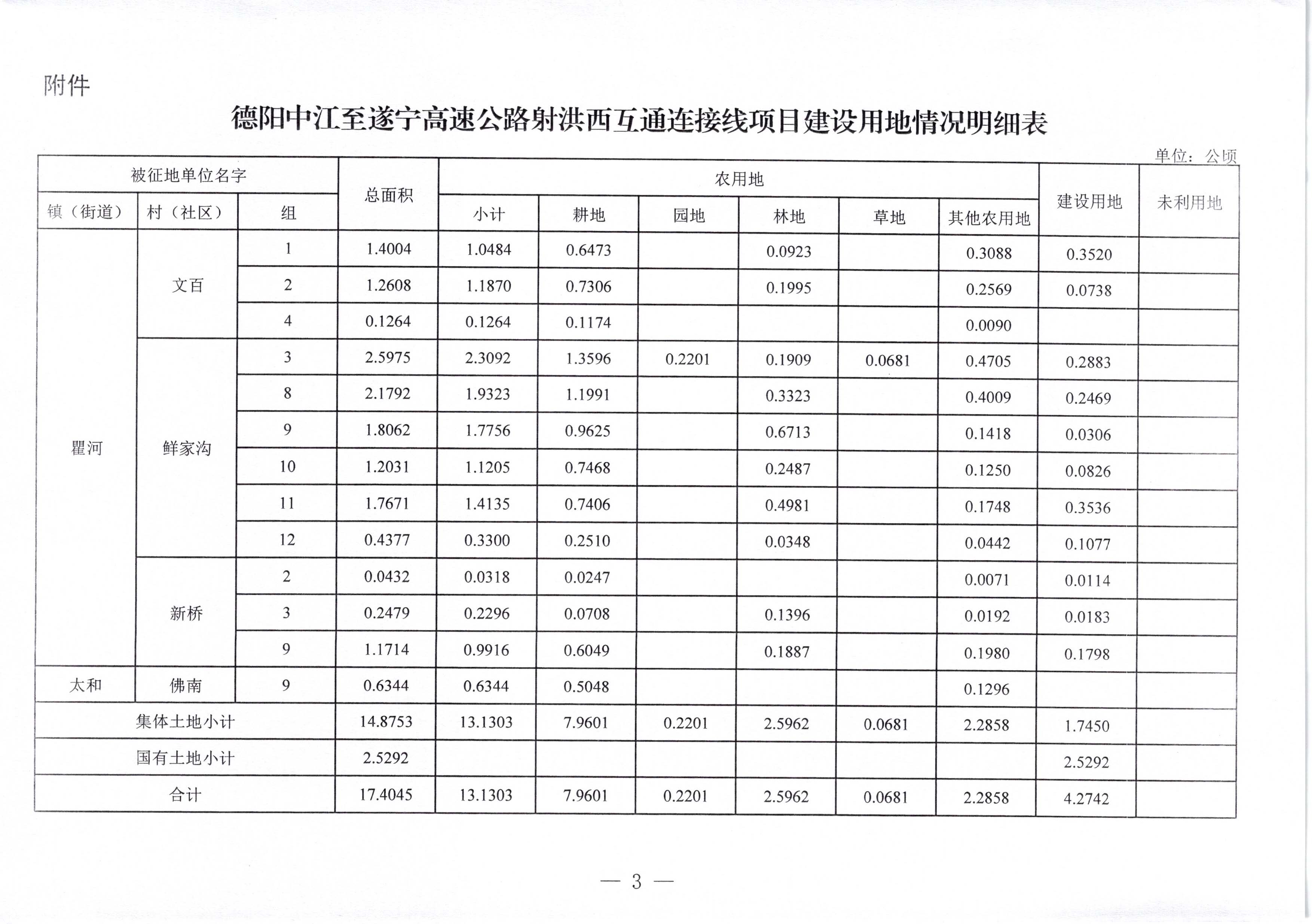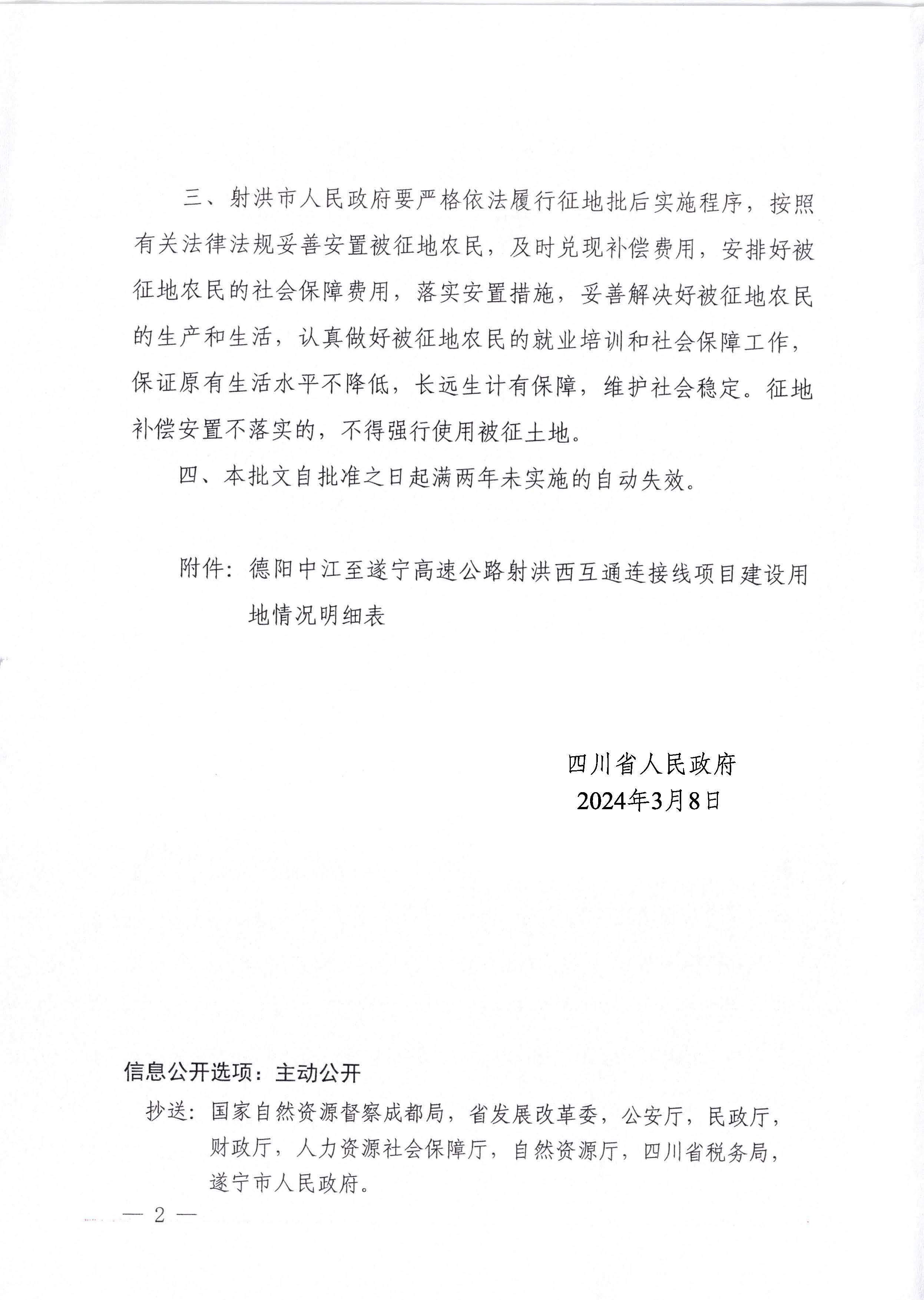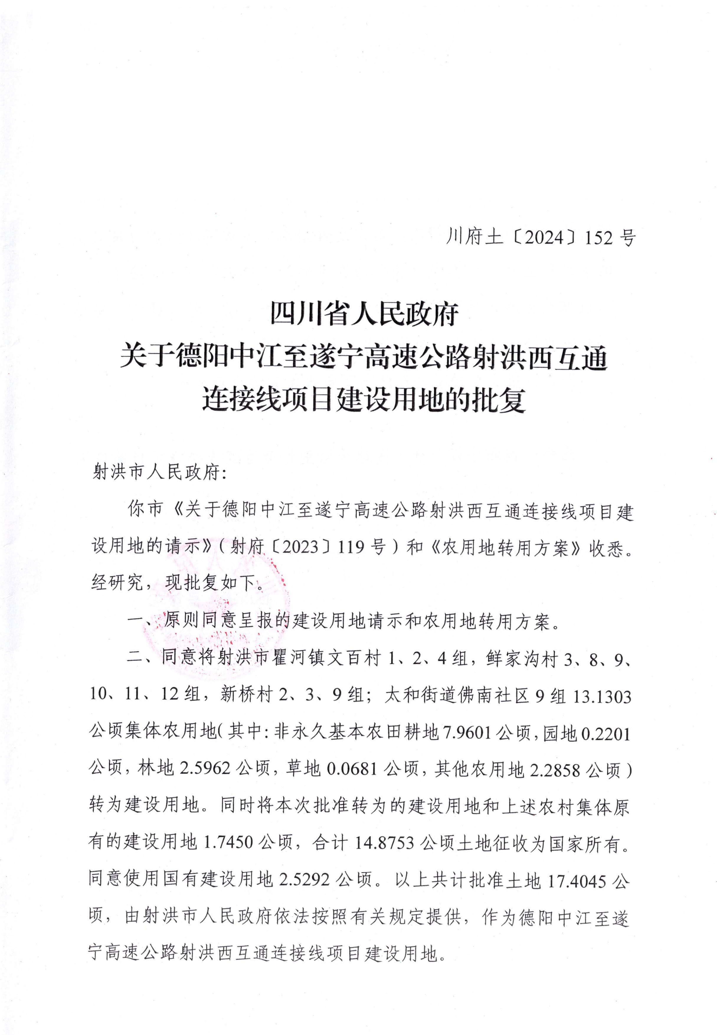 四川省人民政府关于德阳中江至遂宁高速公路射洪西互通连接线项目建设用地的批复(川府土〔2024〕152号)