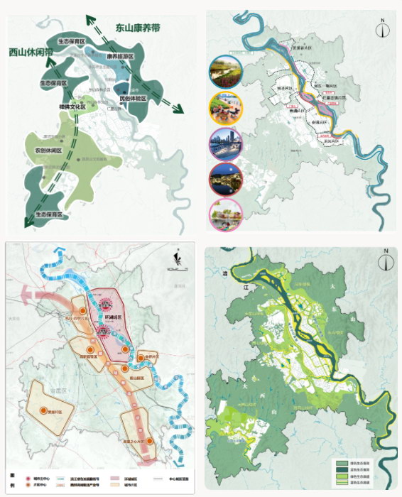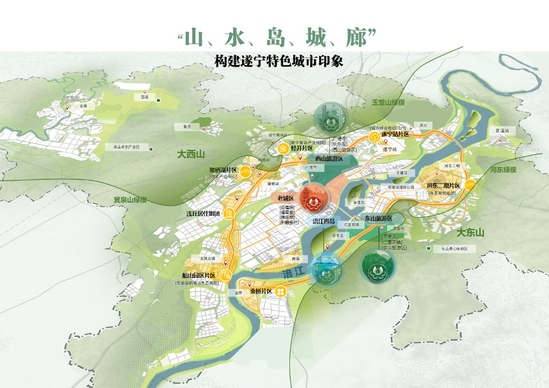 提活力:通过文脉传承、城市更新、产城融合提升品质与活力。通过城市设计手段,结合遂宁自身特色,塑造游山亲水、乐活宜居的特色廊道与公共空间,更好地满足人民日益增长的美好生活需要。