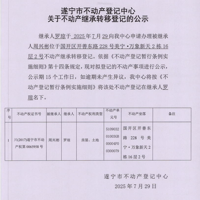 遂宁市不动产登记中心关于不动产继承转移登记的公示(罗琼)