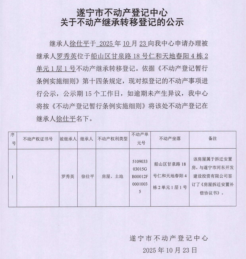 遂宁市不动产登记中心关于不动产继承转移登记的公示(徐仕平)