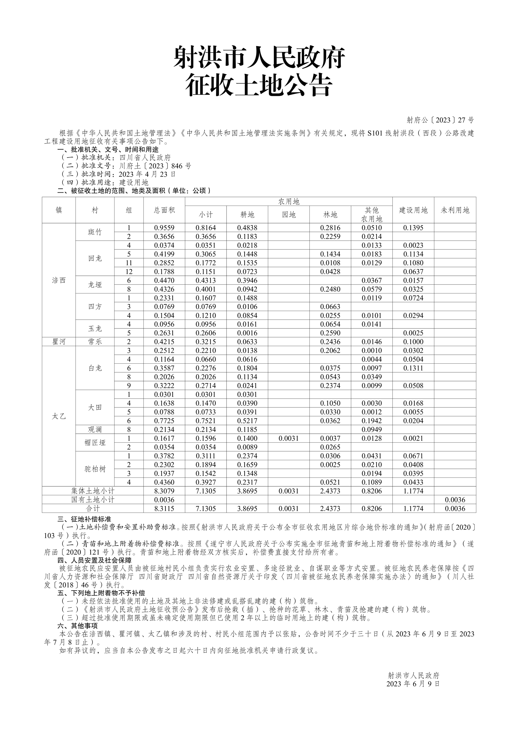 射洪市人民政府征收土地公告(射府公〔2023〕27号)
