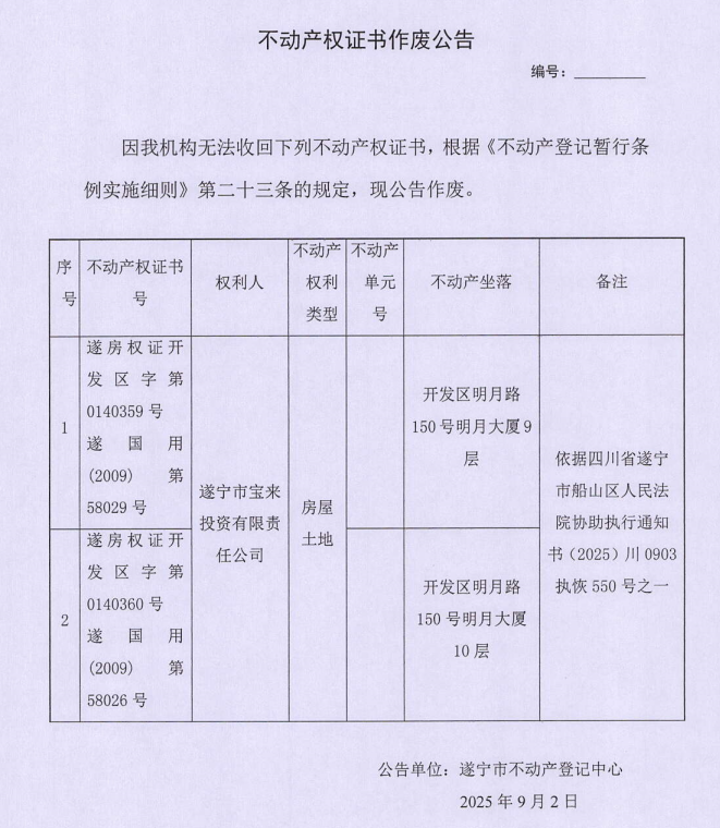 不动产权证书作废公告(遂宁市宝来投资有限责任公司)