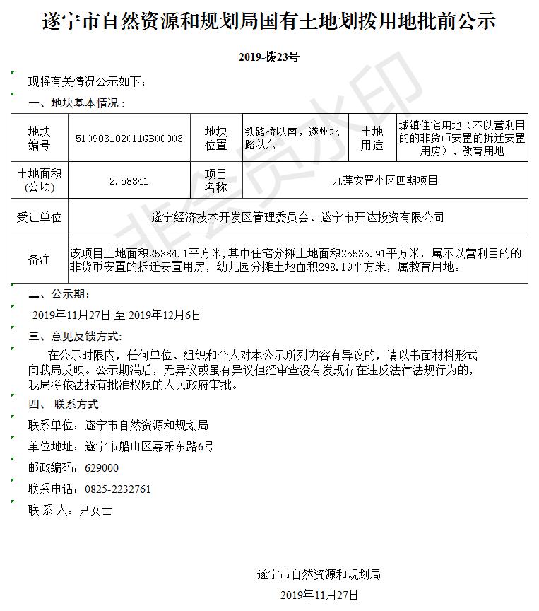 遂宁市自然资源和规划局国有土地划拨用地批前公示(2019-拨23号)