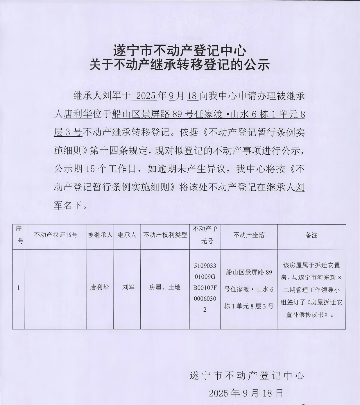遂宁市不动产登记中心关于不动产继承转移登记的公示(刘军)