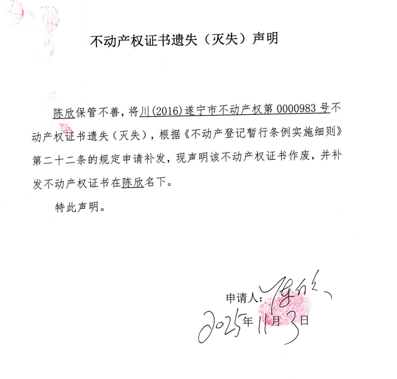 不动产权证书遗失(灭失)声明(陈欣)