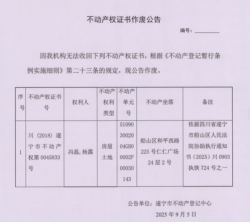 不动产权证书作废公告(冯磊、杨露)