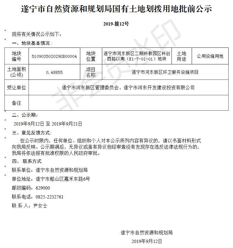 遂宁市自然资源和规划局国有土地划拨用地批前公示(2019-拨12号)