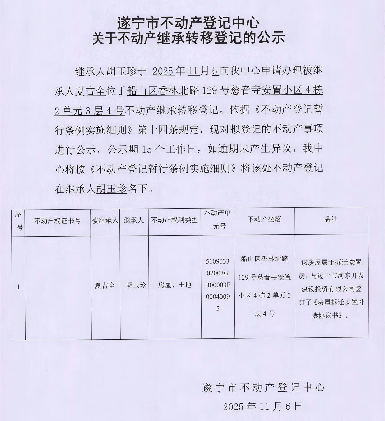遂宁市不动产登记中心关于不动产继承转移登记的公示(胡玉珍)