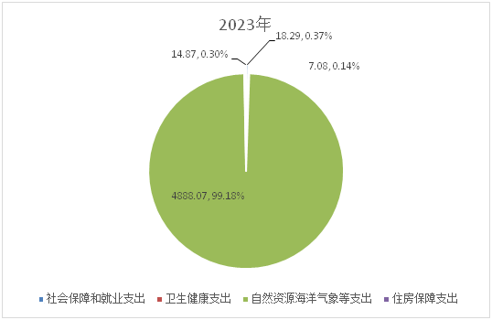 2023年一般公共预算财政拨款支出4928.31万元,主要用于以下方面:社会保障和就业支出18.29万元,占0.37%;卫生健康支出7.08万元,占0.14%;自然资源海洋气象等支出4888.07万元,占99.18%;住房保障支出14.87万元,占0.30%。
