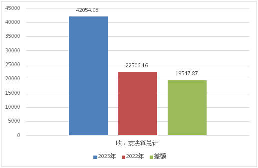 2023年度收、支总计均为42054.03万元。与2022年度相比,收、支总计各增加19547.87万元,增长86.86%。主要变动原因是2023年国有土地使用权出让款收支比上年度大幅增加