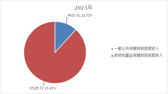 2023年度本年收入合计42054.03万元,其中:一般公共预算财政拨款收入4928.31万元,占11.72%;政府性基金预算财政拨款收入37125.72万元,占88.28%。