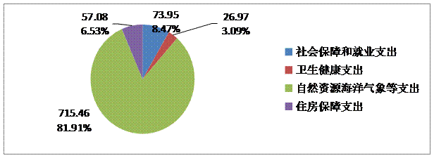 2023年一般公共预算财政拨款支出873.46万元,主要用于以下方面:社会保障和就业支出73.95万元,占8.47%;卫生健康支出26.97万元,占3.09%;自然资源海洋气象等支出715.46万元,占81.91%;住房保障支出57.08万元,占6.53%。