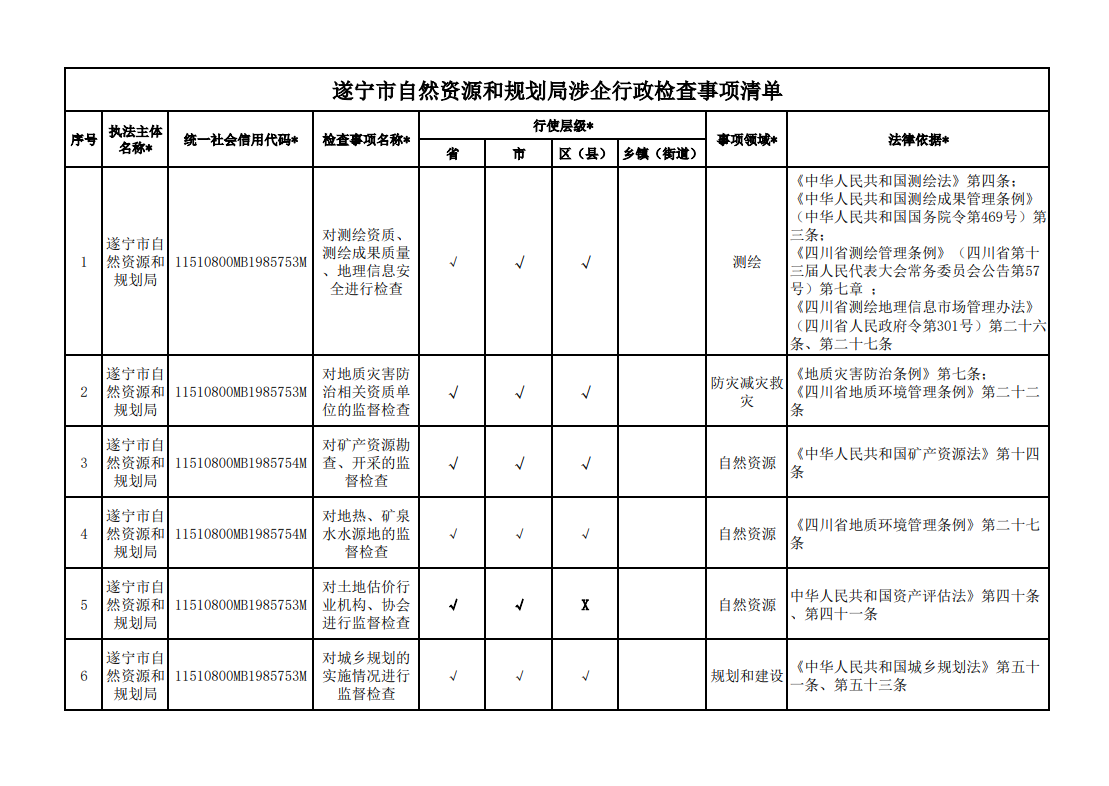 遂宁市自然资源和规划局涉企行政检查事项清单