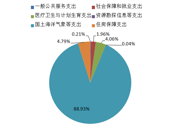 遂宁市国土资源局2016年一般公共预算财政拨款支出2333.52万元,主要用于以下方面:一般公共服务支出5万元,占0.21%;社会保障和就业支出45.85万元,占1.96%;医疗卫生支出94.66万元,占4.06%;资源勘探信息等支出1万元,占0.04%;国土海洋气象等支出2075.25万元,占88.93%;住房保障支出111.75万元,占4.79%。
