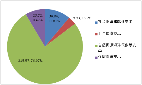 2023年度一般公共预算财政拨款支出280.07万元,主要用于以下方面:社会保障和就业支出30.84万元,占11.01%;卫生健康支出9.93万元,占3.55%;自然资源海洋气象等支出215.57万元,占76.97%;住房保障支出23.72万元,占8.47%。