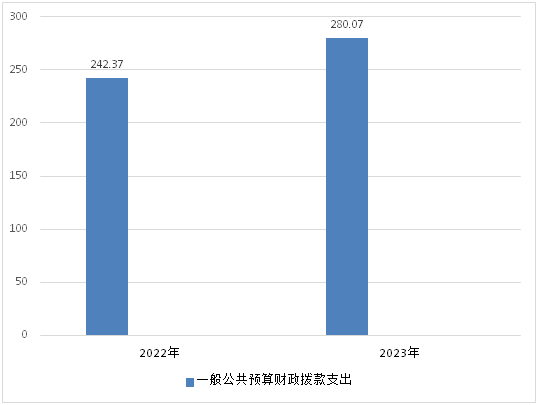 2023年度一般公共预算财政拨款支出280.07万元,占本年支出合计的100%。与2022年度相比,一般公共预算财政拨款支出增加37.7万元,增长15.55%。主要变动原因是人员工资、社保费用增加。