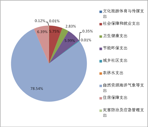 2021年一般公共预算财政拨款支出4141.93万元,主要用于以下方面: 文化旅游体育与传媒支出(类)支出0.51万元,占0.01%;节能环保支出(类)248.03万元,占5.99%;城乡社区支出(类)支出14.45万元,占0.35%;自然资源海洋气象等支出(类)支出3253.16万元,占78.54%;社会保障和就业(类)支出238.27万元,占5.75%;卫生健康支出(类)117.35万元,占2.83%;住房保障支出(类)264.86万元,占6.39%;农林水支出(类)0.3万元,占0.01%;灾害防治及应急管理支出(类)5万元,占0.12%。