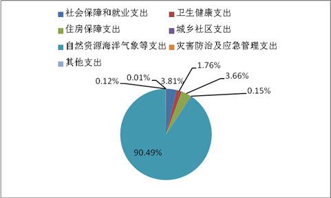 2020年一般公共预算财政拨款支出3374.92万元,主要用于以下方面: 社会保障和就业支出128.44万元,占3.81%;卫生健康支出59.29万元,占1.76%;住房保障支出123.57万元,占3.66%;城乡社区支出5.21万元,占0.15%;自然资源海洋气象等支出3054.02万元,占90.49%;灾害防治及应急管理支出4万元,占0.12%;其他支出0.4万元,占0.01%。